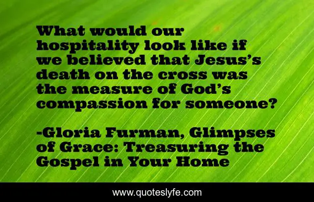 This page presents the quote "What would our hospitality look like if we believed that Jesus’s death on the cross was the measure of God’s compassion for someone?". Author of this quote is Gloria Furman, Glimpses of Grace: Treasuring the Gospel in Your Home. This quote is about death, cross, loc1318, jesus,.
