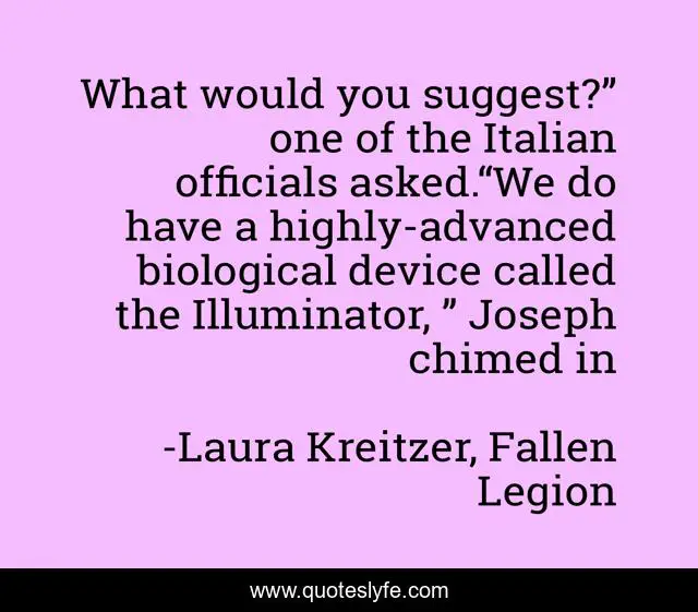This page presents the quote "What would you suggest?” one of the Italian officials asked.“We do have a highly-advanced biological device called the Illuminator, ” Joseph chimed in". Author of this quote is Laura Kreitzer, Fallen Legion. This quote is about humor, laura-kreitzer, fantasy, paranormal, fiction, timeless-series, fallen-legion, angels,.