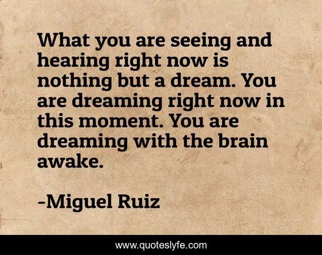 This page presents the quote "What you are seeing and hearing right now is nothing but a dream. You are dreaming right now in this moment. You are dreaming with the brain awake.". Author of this quote is Miguel Ruiz. This quote is about four-agreements, life, toltec-wisdom, god, spirituality, oneness, dreaming, toltec,.