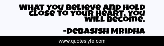 This page presents the quote "What you believe and hold close to your heart, you will become.". Author of this quote is Debasish Mridha. This quote is about quotes, philosophy, debasish-mridha, close-to-your-heart, what-you-will-become, debasish-mridha-md, inspirational, enthusiasm, what-you-believe,.