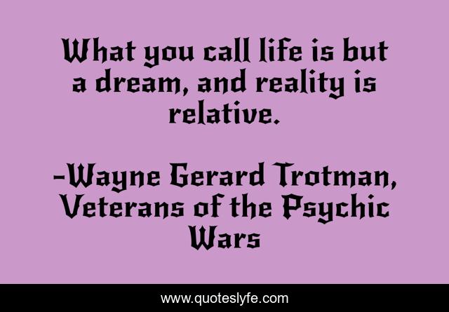 This page presents the quote "What you call life is but a dream, and reality is relative.". Author of this quote is Wayne Gerard Trotman, Veterans of the Psychic Wars. This quote is about real, life, life-and-living, life-experience, belief, relativity, reality-of-life, science-fiction, reality,.