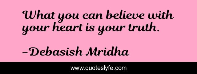 This page presents the quote "What you can believe with your heart is your truth.". Author of this quote is Debasish Mridha. This quote is about believe-with-your-heart, inspirational, life-wisdom, philosophy, debasish-mridha, quotes, truth, enthusiasm, what-you-believe,.