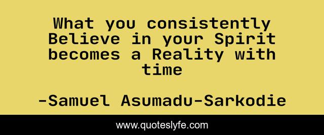 This page presents the quote "What you consistently Believe in your Spirit becomes a Reality with time". Author of this quote is Samuel Asumadu-Sarkodie. This quote is about proverbs, words-of-knowledge, discernment, parables, words-of-wisdom, inspiration,.