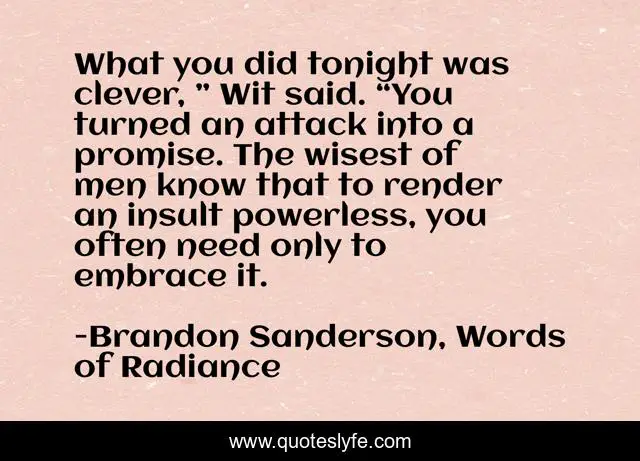 This page presents the quote "What you did tonight was clever, ” Wit said. “You turned an attack into a promise. The wisest of men know that to render an insult powerless, you often need only to embrace it.". Author of this quote is Brandon Sanderson, Words of Radiance. This quote is about hoid, wit, wise, insult,.