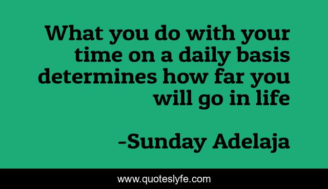 This page presents the quote "What you do with your time on a daily basis determines how far you will go in life". Author of this quote is Sunday Adelaja. This quote is about life, blessing, finance, money, work, time-management, job, joblessness, purpose,.