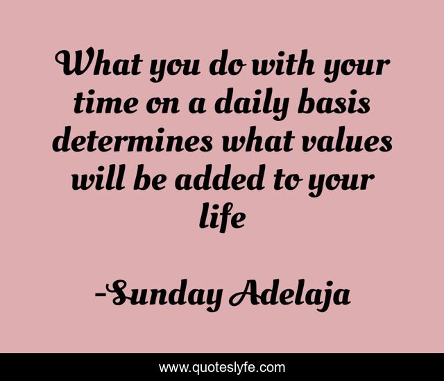 This page presents the quote "What you do with your time on a daily basis determines what values will be added to your life". Author of this quote is Sunday Adelaja. This quote is about life, blessing, finance, money, work, time-management, value, job, joblessness,.