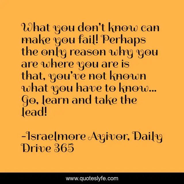 This page presents the quote "What you don't know can make you fail! Perhaps the only reason why you are where you are is that, you've not known what you have to know... Go, learn and take the lead!". Author of this quote is Israelmore Ayivor, Daily Drive 365. This quote is about training, take-the-lead, knowledge, skills, study, practice, fail, reason, train,.