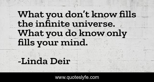 This page presents the quote "What you don’t know fills the infinite universe. What you do know only fills your mind.". Author of this quote is Linda Deir. This quote is about enthusiasm, perception, awareness, inspirational,.
