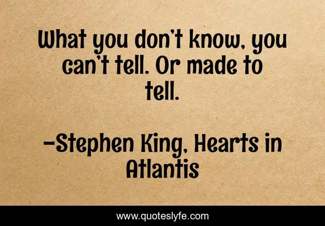 This page presents the quote "What you don’t know, you can’t tell. Or made to tell.". Author of this quote is Stephen King, Hearts in Atlantis. .