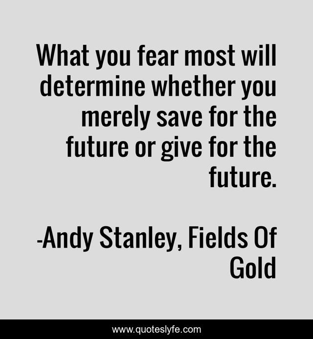 This page presents the quote "What you fear most will determine whether you merely save for the future or give for the future.". Author of this quote is Andy Stanley, Fields Of Gold. This quote is about giving, fear, sharing, saving, stewardship,.