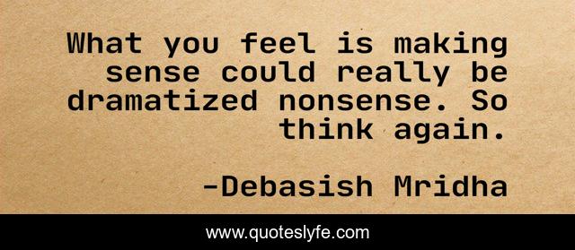 This page presents the quote "What you feel is making sense could really be dramatized nonsense. So think again.". Author of this quote is Debasish Mridha. This quote is about what-you-feel, philosophy, debasish-mridha, making-sense, quotes, think-again, debasish-mridha-md, inspirational, enthusiasm,.