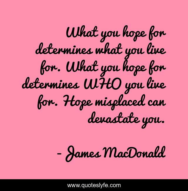 This page presents the quote "What you hope for determines what you live for. What you hope for determines WHO you live for. Hope misplaced can devastate you.". Author of this quote is James MacDonald. This quote is about aspirations, thinking, dreams, emotions,.