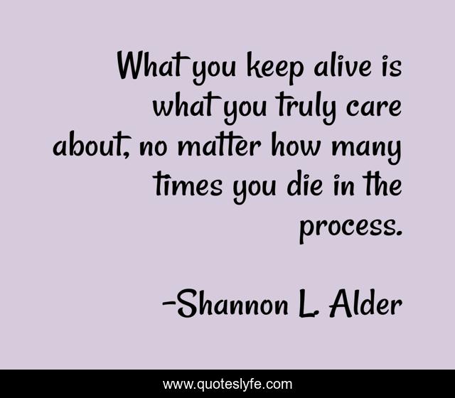 This page presents the quote "What you keep alive is what you truly care about, no matter how many times you die in the process.". Author of this quote is Shannon L. Alder. This quote is about relationships, heart, suicide, love, novels, career, memories, mind, writing,.