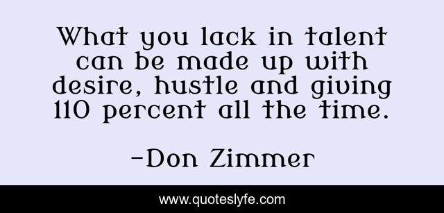 This page presents the quote "What you lack in talent can be made up with desire, hustle and giving 110 percent all the time.". Author of this quote is Don Zimmer. This quote is about giving, talent, hustle,.