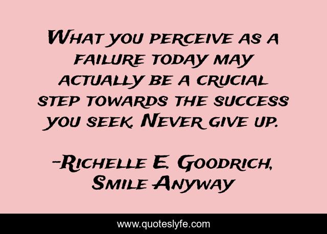 This page presents the quote "What you perceive as a failure today may actually be a crucial step towards the success you seek. Never give up.". Author of this quote is Richelle E. Goodrich, Smile Anyway. This quote is about perseverance, success, trials, drive, failure, richelle, richelle-goodrich, determination,.