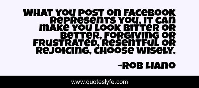 This page presents the quote "What you post on Facebook represents you, it can make you look bitter or better, forgiving or frustrated, resentful or rejoicing, choose wisely.". Author of this quote is Rob Liano. This quote is about caring, life, sharing, love, better-life, relationship-advice, motivation, accountability, quotes,.