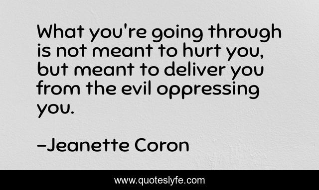 This page presents the quote "What you're going through is not meant to hurt you, but meant to deliver you from the evil oppressing you.". Author of this quote is Jeanette Coron. This quote is about demonic-oppression, deliverence, pain, dificult-times, pressure, going-through-the-fire, baptism-through-fire, spiritual-cleansing, going-through,.