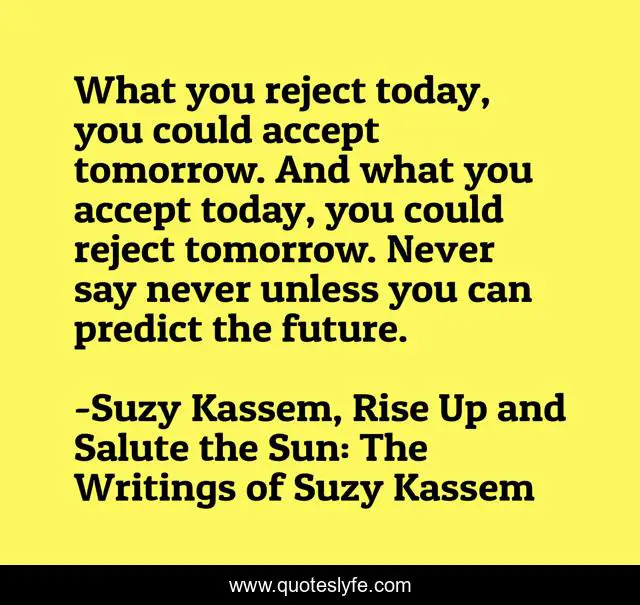 This page presents the quote "What you reject today, you could accept tomorrow. And what you accept today, you could reject tomorrow. Never say never unless you can predict the future.". Author of this quote is Suzy Kassem, Rise Up and Salute the Sun: The Writings of Suzy Kassem. This quote is about relationships, yesterday, accept, beliefs, ideology, mantra, future, reject, tolerance,.