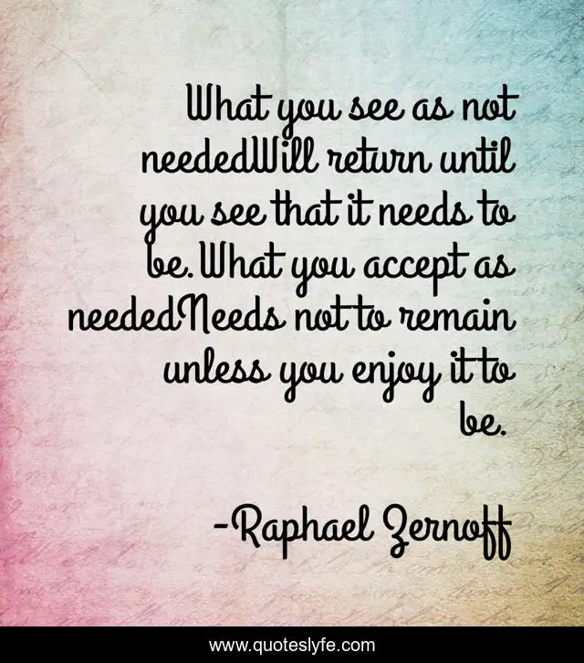 This page presents the quote "What you see as not neededWill return until you see that it needs to be.What you accept as neededNeeds not to remain unless you enjoy it to be.". Author of this quote is Raphael Zernoff. This quote is about life-coaching, channelling, spiritual, awakening, wisdom, mystery-school, raphael-zernoff, awakened,.