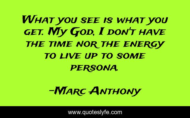 This page presents the quote "What you see is what you get. My God, I don't have the time nor the energy to live up to some persona.". Author of this quote is Marc Anthony. This quote is about energy, live, time,.