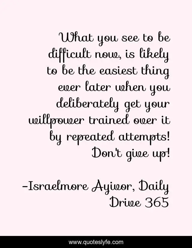 This page presents the quote "What you see to be difficult now, is likely to be the easiest thing ever later when you deliberately get your willpower trained over it by repeated attempts! Don't give up!". Author of this quote is Israelmore Ayivor, Daily Drive 365. This quote is about food-for-thought, repeat, difficulties, deliberate, hard, willpower, intentionally, repeated-attempts, willing,.