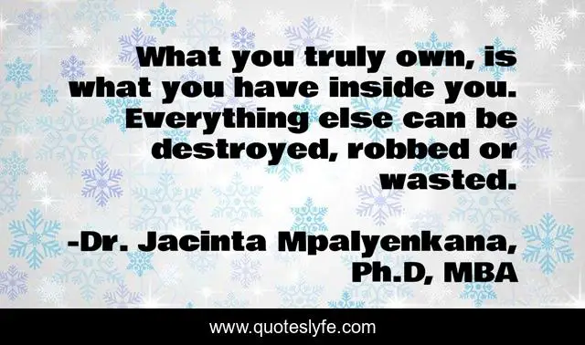 This page presents the quote "What you truly own, is what you have inside you. Everything else can be destroyed, robbed or wasted.". Author of this quote is Dr. Jacinta Mpalyenkana, Ph.D, MBA. This quote is about inner-strength, personal-development, inner-power, personal-growth,.