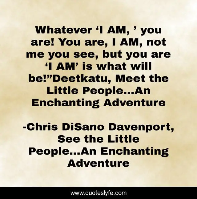 This page presents the quote "Whatever ‘I AM, ’ you are! You are, I AM, not me you see, but you are ‘I AM’ is what will be!”Deetkatu, Meet the Little People…An Enchanting Adventure". Author of this quote is Chris DiSano Davenport, See the Little People...An Enchanting Adventure. This quote is about spiritual, little-people, inspirational, enthusiasm, childrens-books, fairie-tales,.
