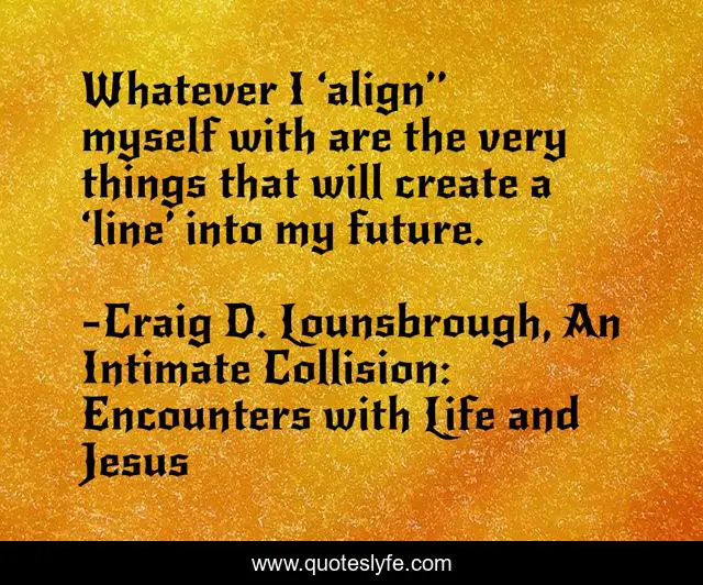 This page presents the quote "Whatever I ‘align’’ myself with are the very things that will create a ‘line’ into my future.". Author of this quote is Craig D. Lounsbrough, An Intimate Collision: Encounters with Life and Jesus. This quote is about morals, align, commitment, priorities, focus, future, values, goals, ethics,.