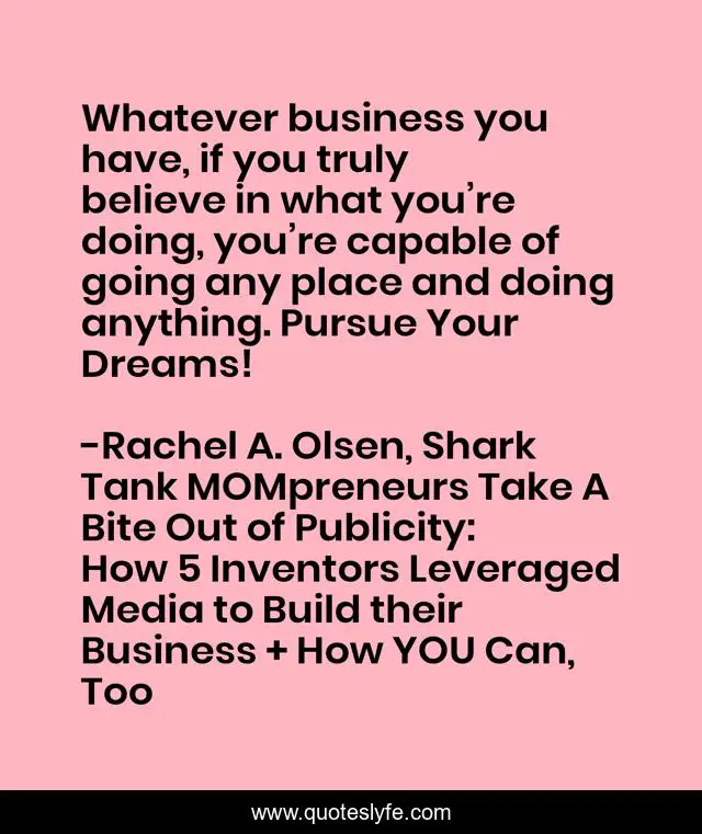 This page presents the quote "Whatever business you have, if you truly believe in what you’re doing, you’re capable of going any place and doing anything. Pursue Your Dreams!". Author of this quote is Rachel A. Olsen, Shark Tank MOMpreneurs Take A Bite Out of Publicity: How 5 Inventors Leveraged Media to Build their Business + How YOU Can, Too. This quote is about start-up, entrepreneurship, business, success, inspiration,.