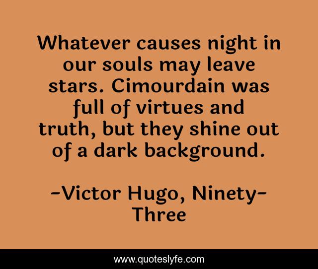 This page presents the quote "Whatever causes night in our souls may leave stars. Cimourdain was full of virtues and truth, but they shine out of a dark background.". Author of this quote is Victor Hugo, Ninety-Three. .