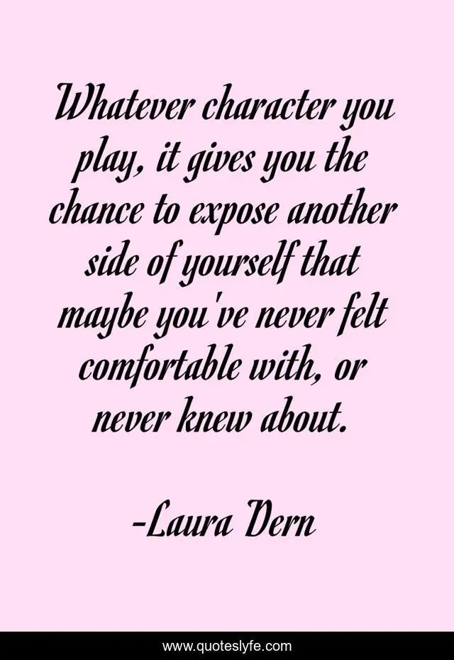 This page presents the quote "Whatever character you play, it gives you the chance to expose another side of yourself that maybe you've never felt comfortable with, or never knew about.". Author of this quote is Laura Dern. This quote is about play, character, yourself,.