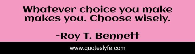 This page presents the quote "Whatever choice you make makes you. Choose wisely.". Author of this quote is Roy T. Bennett. This quote is about motivation, inspire, optimistic, inspirational-life, life-and-living, living, inspiring, positive, positive-thinking,.