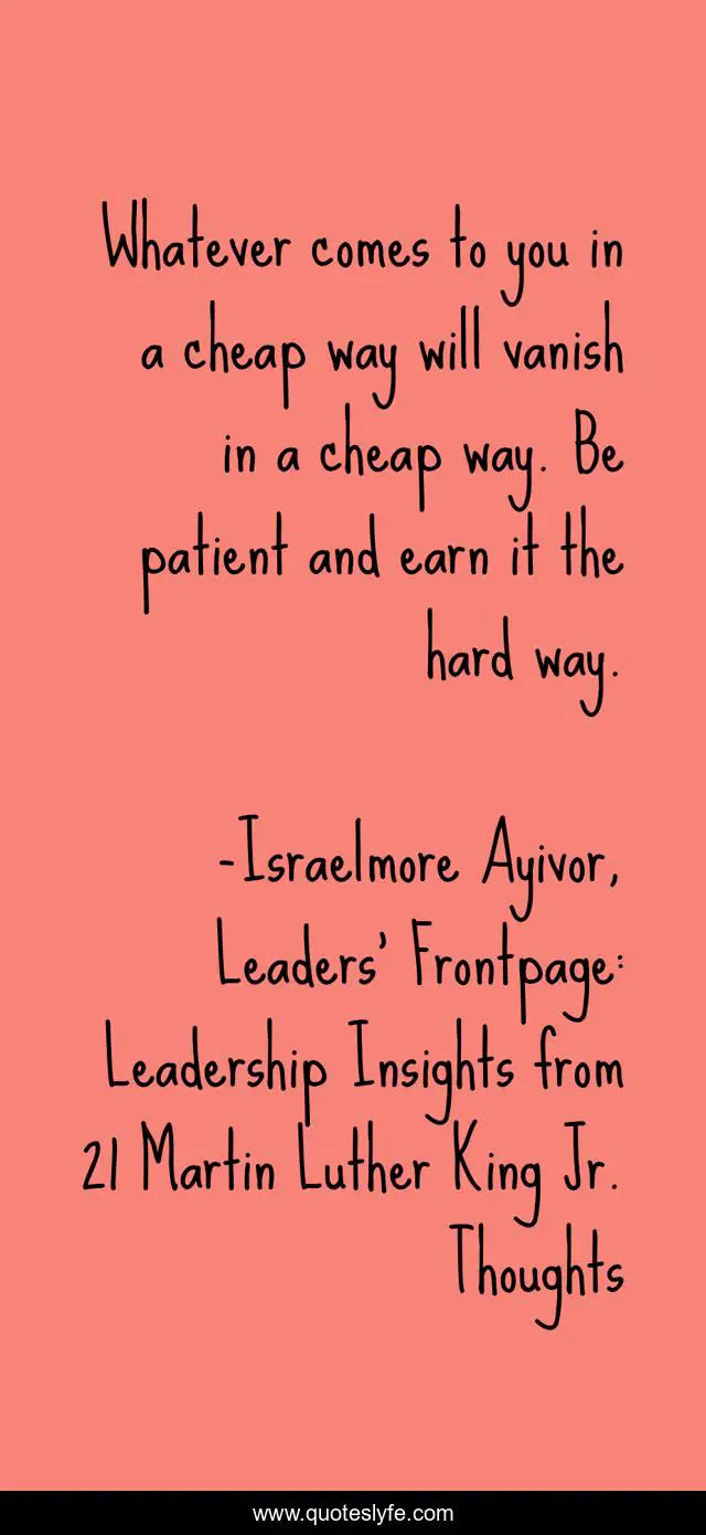 This page presents the quote "Whatever comes to you in a cheap way will vanish in a cheap way. Be patient and earn it the hard way.". Author of this quote is Israelmore Ayivor, Leaders' Frontpage: Leadership Insights from 21 Martin Luther King Jr. Thoughts. This quote is about impatient, earn, martin-luther, patient, leaders, hard-work, work-hard, hard, cheap,.