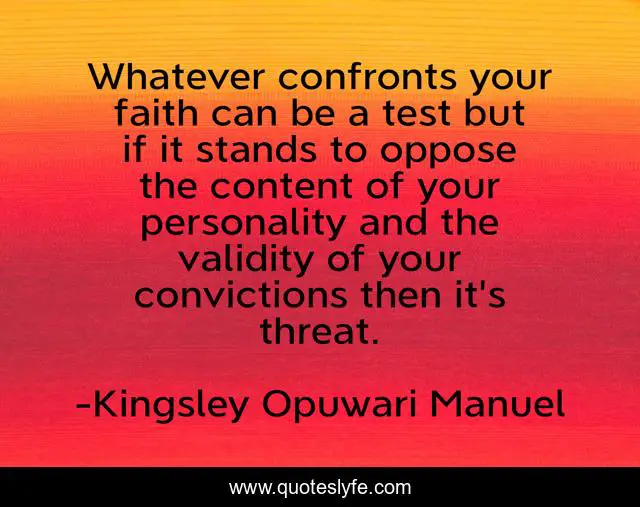 This page presents the quote "Whatever confronts your faith can be a test but if it stands to oppose the content of your personality and the validity of your convictions then it's threat.". Author of this quote is Kingsley Opuwari Manuel. This quote is about faith, holiness, challenge, christianity, christian-living, inspirational, sanctification, enthusiasm, trouble,.