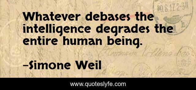 This page presents the quote "Whatever debases the intelligence degrades the entire human being.". Author of this quote is Simone Weil. This quote is about human being, human, whatever,.