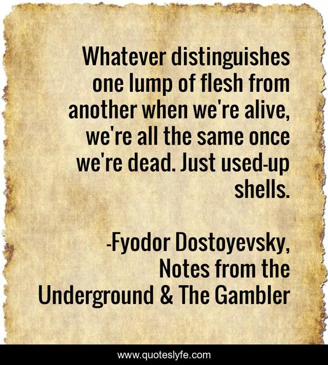 This page presents the quote "Whatever distinguishes one lump of flesh from another when we're alive, we're all the same once we're dead. Just used-up shells.". Author of this quote is Fyodor Dostoyevsky, Notes from the Underground & The Gambler. .