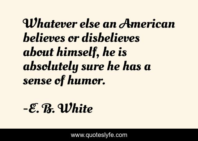 This page presents the quote "Whatever else an American believes or disbelieves about himself, he is absolutely sure he has a sense of humor.". Author of this quote is E. B. White. This quote is about american, sense of humor,.