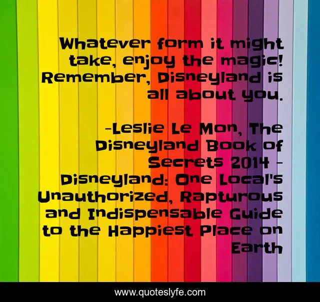 "Leslie Le Mon, The Disneyland Book of Secrets 2014 - Disneyland: One Local's Unauthorized, Rapturous and Indispensable Guide to the Happiest Place on Earth Quotes." Quoteslyfe.com, 2025. Fri. 05 Dec. 2025. <https://www.quoteslyfe.com/quote/Whatever-form-it-might-take-enjoy-the-133946>.