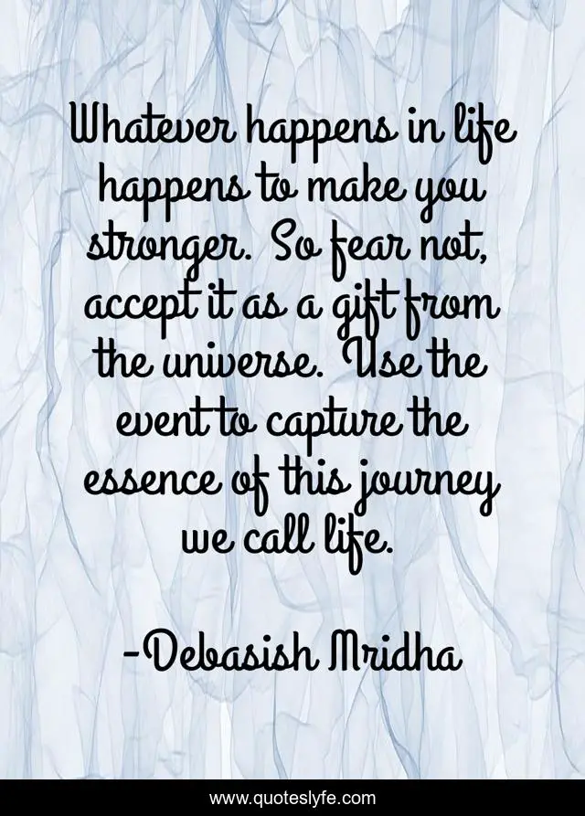 This page presents the quote "Whatever happens in life happens to make you stronger. So fear not, accept it as a gift from the universe. Use the event to capture the essence of this journey we call life.". Author of this quote is Debasish Mridha. This quote is about what-makes-you-stronger, miraboli, gift-from-the-universe, oscar-wilde, philosophy, debasish-mridha, tagore, quotes, buddha,.