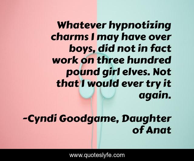 This page presents the quote "Whatever hypnotizing charms I may have over boys, did not in fact work on three hundred pound girl elves. Not that I would ever try it again.". Author of this quote is Cyndi Goodgame, Daughter of Anat. This quote is about romance, ya, elves, hypnotism, paranormal,.