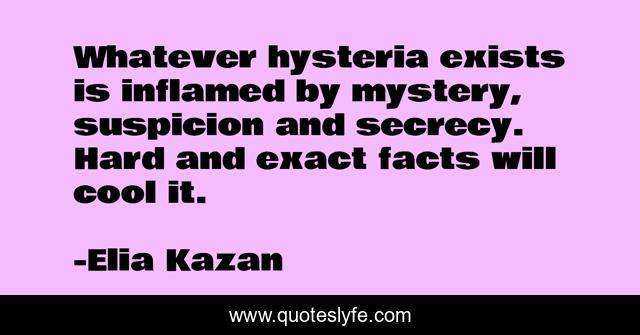 This page presents the quote "Whatever hysteria exists is inflamed by mystery, suspicion and secrecy. Hard and exact facts will cool it.". Author of this quote is Elia Kazan. This quote is about mystery, facts,.