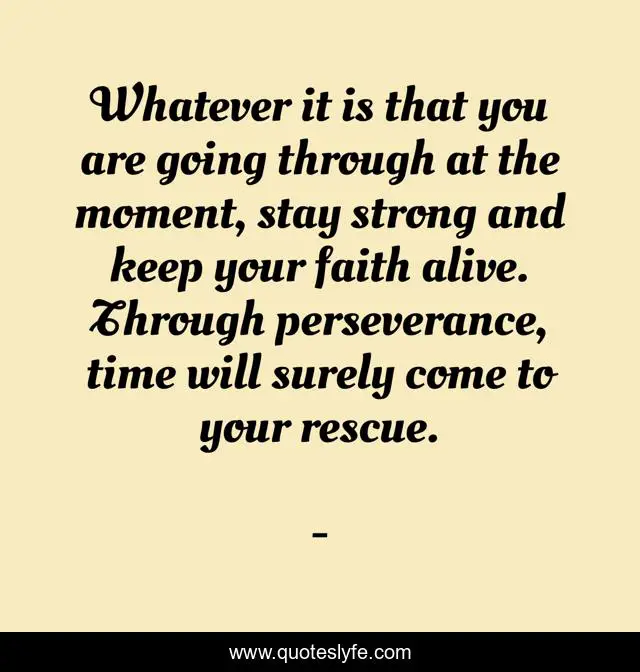This page presents the quote "Whatever it is that you are going through at the moment, stay strong and keep your faith alive. Through perseverance, time will surely come to your rescue.". Author of this quote is . This quote is about persevere, perseverance, edmond-mbiaka, staying-strong-and-positive, stay-strong, keep-your-faith-alive,.