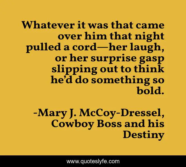 This page presents the quote "Whatever it was that came over him that night pulled a cord—her laugh, or her surprise gasp slipping out to think he’d do something so bold.". Author of this quote is Mary J. McCoy-Dressel, Cowboy Boss and his Destiny. This quote is about novel, contemporary-romance, cowboy, western-romance, rancher, sensual,.