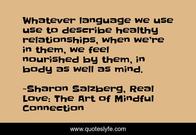 This page presents the quote "Whatever language we use use to describe healthy relationships, when we’re in them, we feel nourished by them, in body as well as mind.". Author of this quote is Sharon Salzberg, Real Love: The Art of Mindful Connection. This quote is about relationships, love, language, relationship, real-love, affection,.
