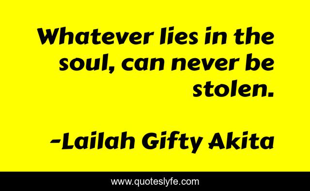 This page presents the quote "Whatever lies in the soul, can never be stolen.". Author of this quote is Lailah Gifty Akita. This quote is about humorous, stolen, christian, soul, inspiration,.