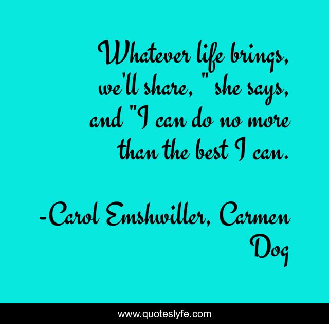 This page presents the quote "Whatever life brings, we'll share, " she says, and "I can do no more than the best I can.". Author of this quote is Carol Emshwiller, Carmen Dog. This quote is about inspirational-attitude, motherhood,.