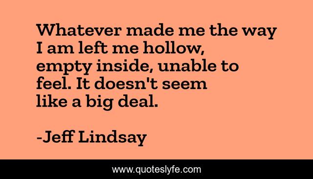 This page presents the quote "Whatever made me the way I am left me hollow, empty inside, unable to feel. It doesn't seem like a big deal.". Author of this quote is Jeff Lindsay. This quote is about emotion, ennui, trauma,.