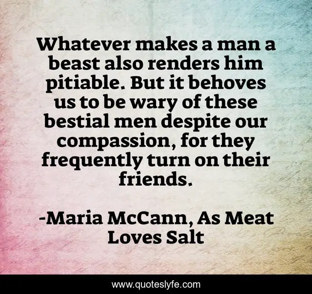 This page presents the quote "Whatever makes a man a beast also renders him pitiable. But it behoves us to be wary of these besti*l men despite our compassion, for they frequently turn on their friends.". Author of this quote is Maria McCann, As Meat Loves Salt. This quote is about compassion, violence, betrayal,.