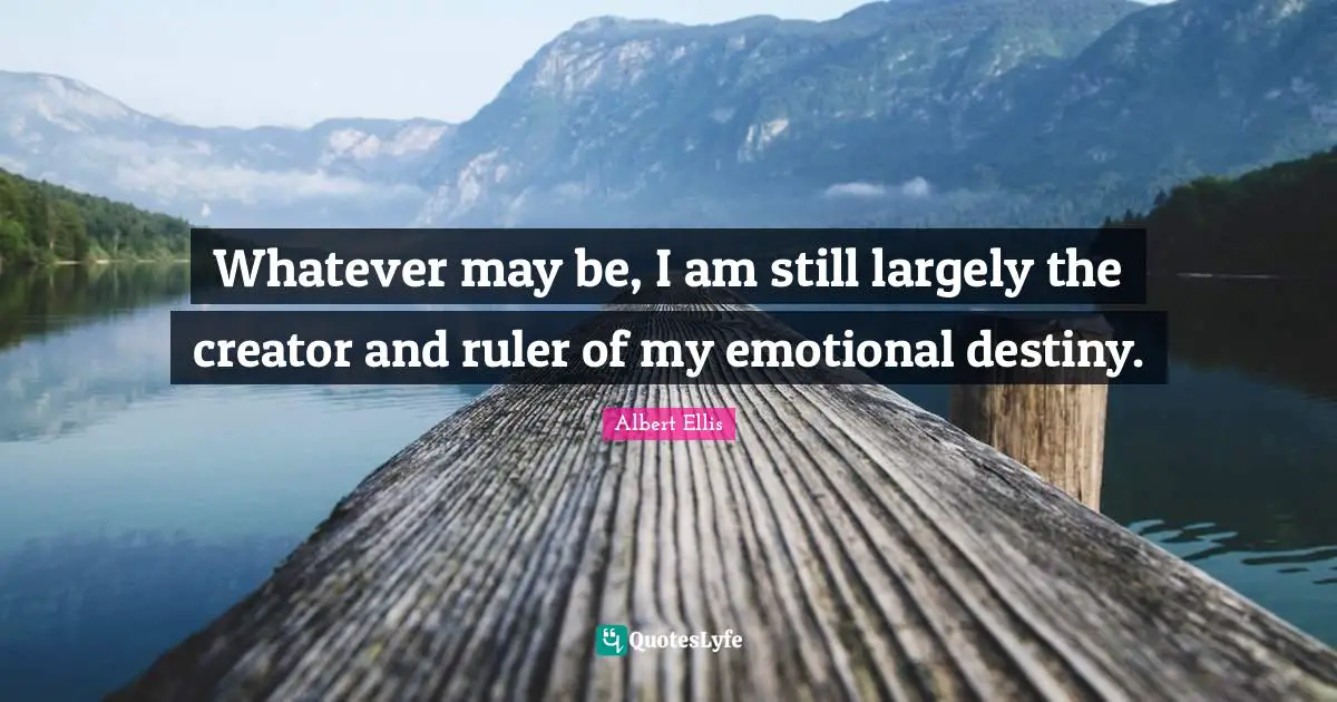 This page presents the quote "Whatever may be, I am still largely the creator and ruler of my emotional destiny.". Author of this quote is Albert Ellis. This quote is about creator, may, destiny, emotional, responsibility,.