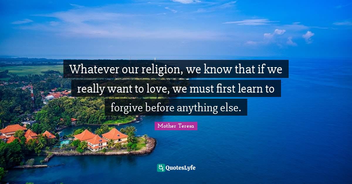 This page presents the quote "Whatever our religion, we know that if we really want to love, we must first learn to forgive before anything else.". Author of this quote is Mother Teresa. This quote is about love, learn to forgive, mother, religion, forgive and forget, want, forgiveness,.